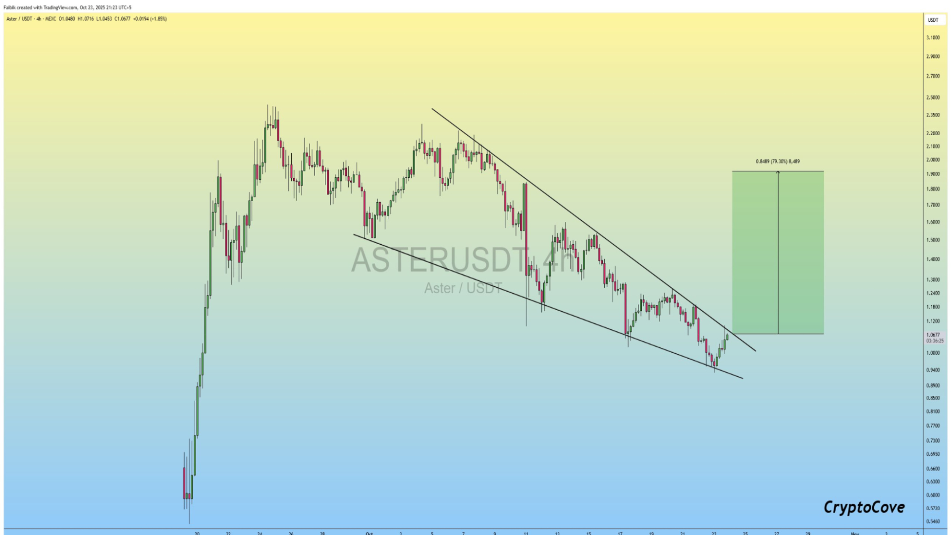 ASTER’s price is moving within a narrowing wedge due to the easing of downward pressure. The current renewed buying interest pushed the price to bounce off the lower trendline.The chart projects potential upside targets between $1.10 and $1.90 if a breakout materialises.