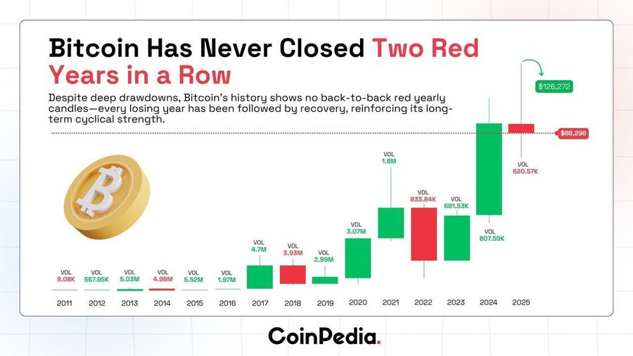 Bitcoin has continued to maintain a long-term historical pattern on the chart. Including the 2021 closing, the asset has never had two consecutive years with negative annual candles since it was created. This pattern has stayed valid even through significant drawdowns, regulatory disruption, and extended weak sentiment.