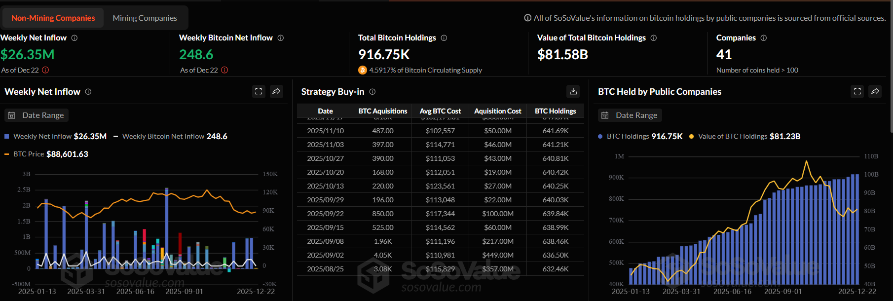 Sosovalue Data tracking non-mining public companies shows continued accumulation of Bitcoin throughout 2025, with positive weekly net inflows, even while BTC price action traded near Cycle Highs. Corporate treasuries collectively now hold over 900k BTC.