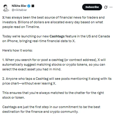 - Cashtags promotes X’s intent to advance payments and financial tools on the platform.