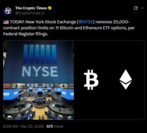 Crypto ETF options have entered a new phase in U.S. derivatives markets after NYSE Arca and NYSE American filed rule changes with the Securities and Exchange Commission to eliminate position and exercise limits tied to spot Bitcoin and Ether exchange-traded funds.