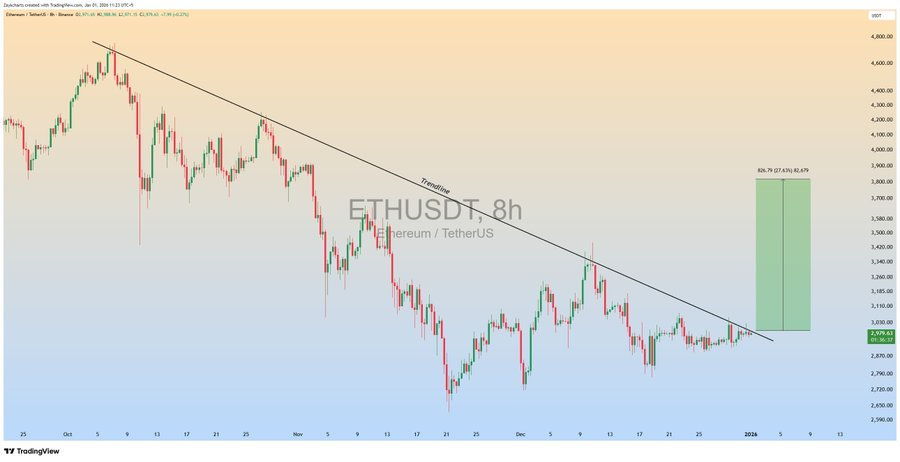 - The price of Ethereum compressed against a long-term descending trendline, but the breakout is still alive around $3000.