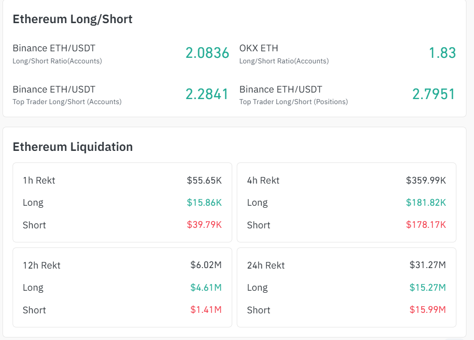 Ethereum sentiment leans bullish as top traders hold strong longs, while balanced liquidations