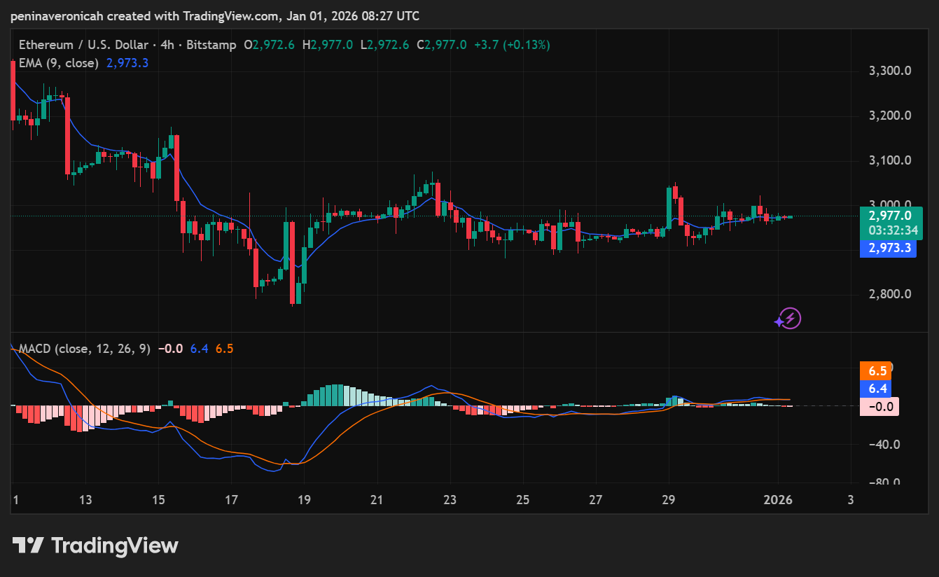 The Ethereum price is currently consolidating on the 4-hour timeframe between $2950 and $3120. However, the price is currently trading slightly above the 9 EMA, indicating short-term strength but a lack of trend confirmation.