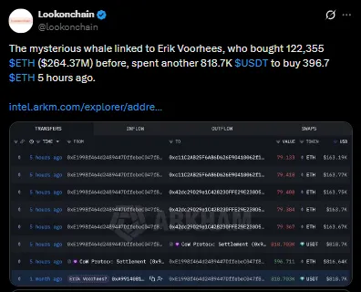The previous day, the wallet purchased 396.7 ETH for 818,700 USDT. These are sales made following the larger write-up of 122,355 ETH, totaling about 264.37 million.