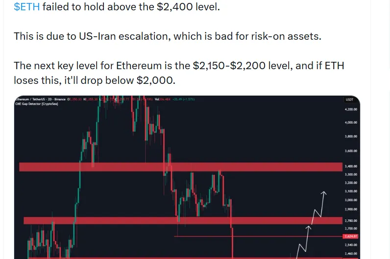 Ether is experiencing a new negative pressure following its inability to break above the major resistance level of $2,400 because the US-Iran tensions are increasing, and the global markets are moving towards a more significant risk-off. This rejection has returned ETH to a precarious area, and traders are keeping a close eye on the support zone of $2,150–$2,200. Failure in this regard may expedite the selling force and push Ethereum under the important threshold of $2,000.