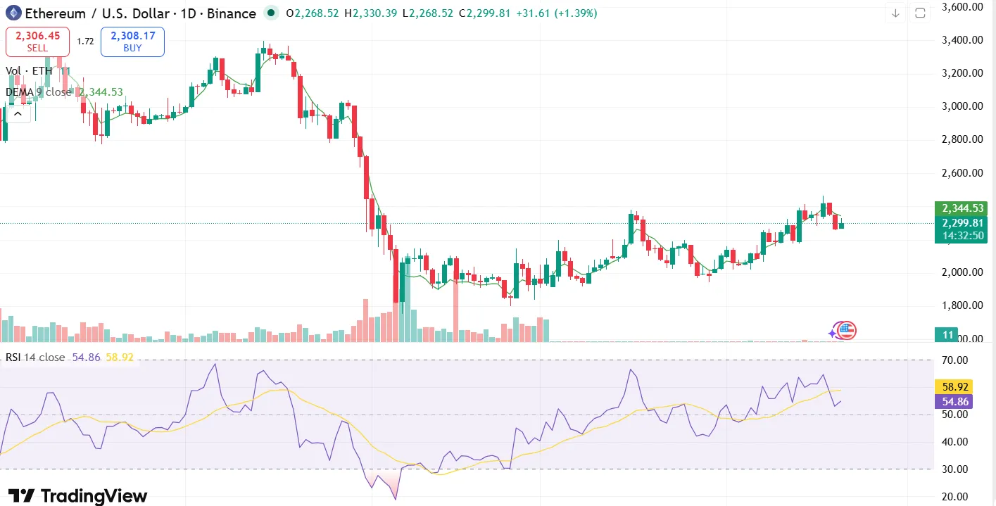 The daily timeframe is seeing Ethereum recover slowly with a drastic correction in the initial part of the year. The price action recovered the $1,800–$1,900 area and has been creating a higher lows series since, which means that buyers are gradually winning the battle. ETH is presently trading on the order of the $2,300 mark and trying to stabilize just below a major resistance area between $2,350-$2,400, which was a supply area in the past.