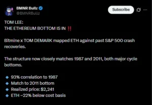 The Ethereum price outlook has been shaped in part by analysis referencing historical equity market patterns. Tom Lee of Bitmine pointed to research conducted by market analyst Tom DeMark, who identified a reported 93% correlation between Ethereum’s recent price structure and the S&P 500 during two past periods: the 1987 market crash and the 2011 correction.