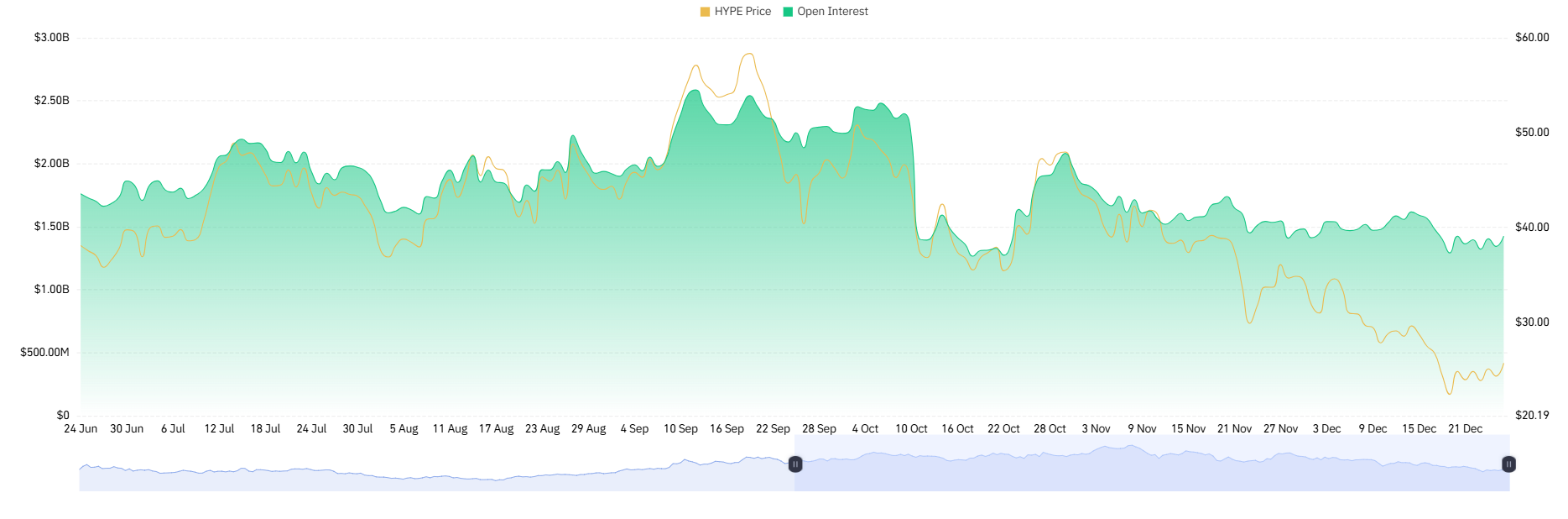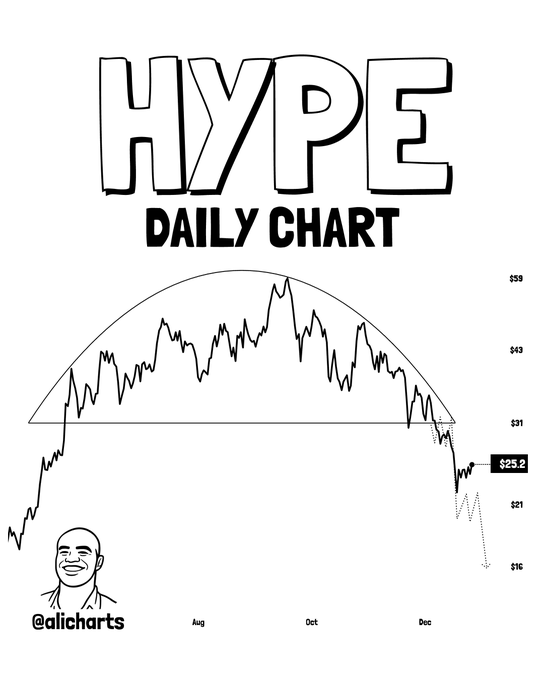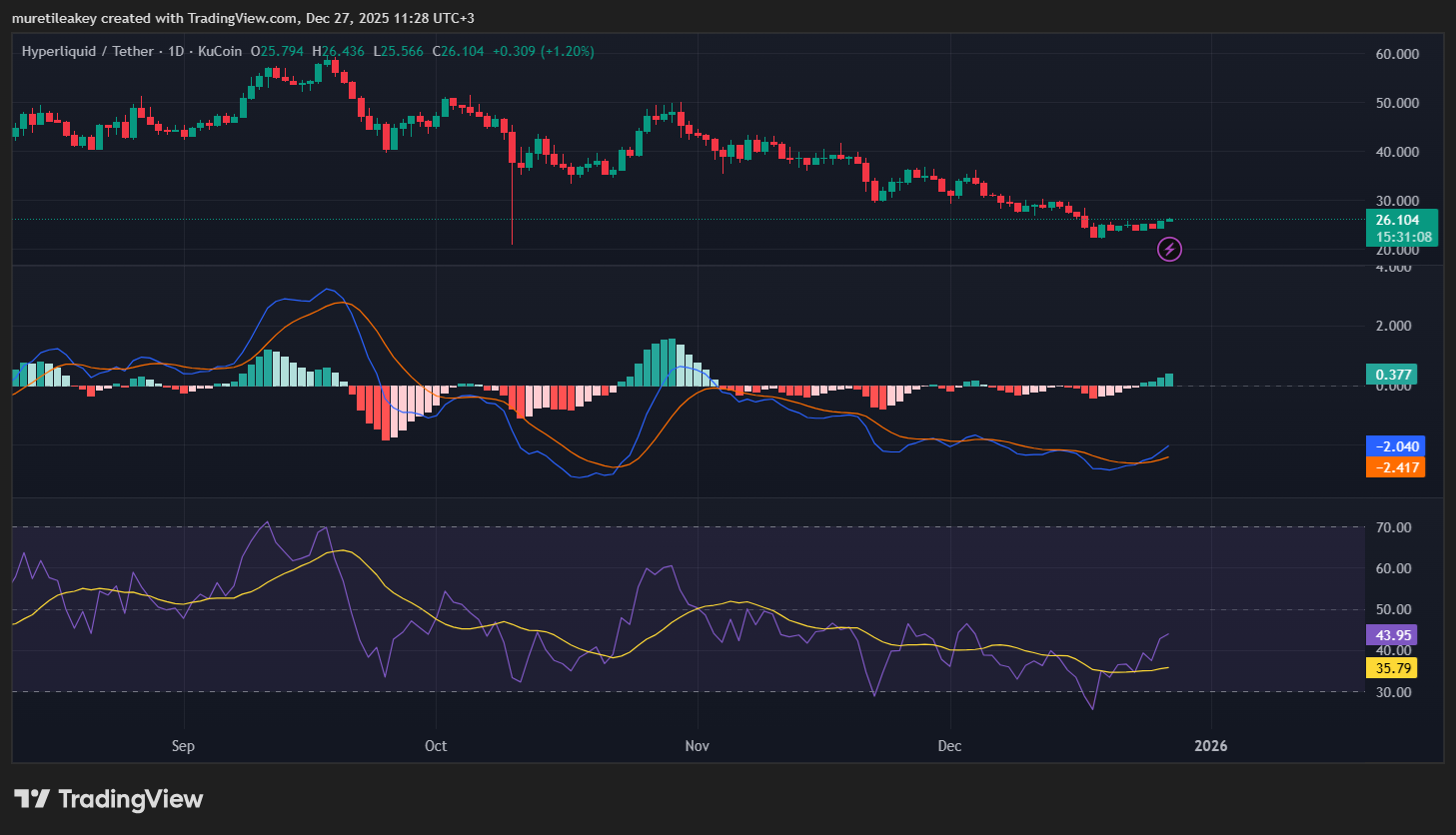 Hyperliquid (HYPE) is currently in a bear market trend after touching $55-$58. The current market trend seems to stabilize around $26, which is above the $25 support level. There have been minor recovery attempts. There are lower highs and lower lows in this market.