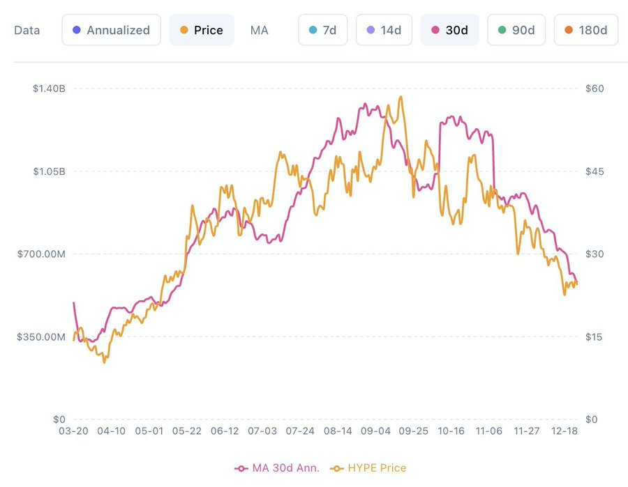 HYPE price closely tracks its 30-day annualized revenue, showing a strong correlation between fundamentals and price movement.
