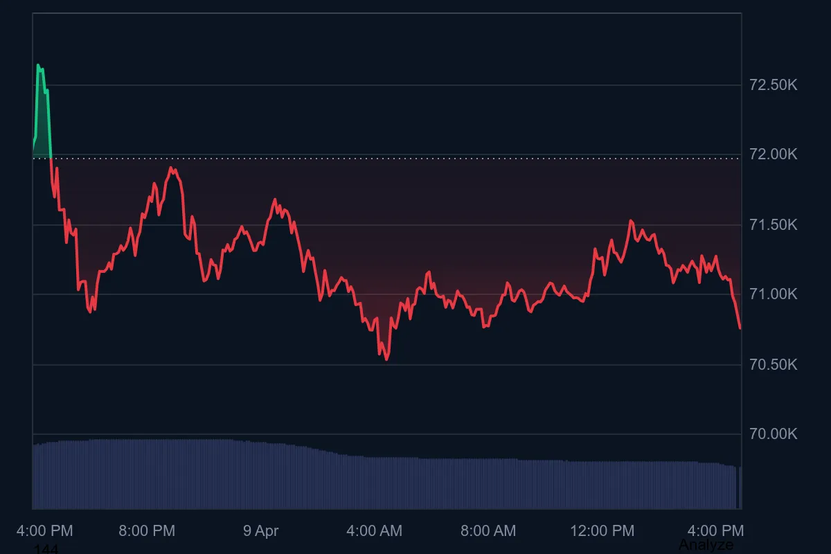 Bitcoin has fallen over the last 24 hours, and the price action indicates intraday volatility is resilient and a weak downward trend. The figures at CoinMarketCap show that BTC dropped approximately 1.08% to $71,157 after rising to $72,500 in the session.