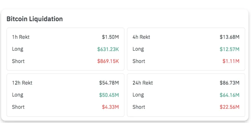 In a span of more than 4hours, liquidations increased to $13.68 million, and long positions took up $12.57 million of forced closures.In the course of twelve hours, overall liquidations had reached up to $54.78 million, which shows the pressure that Bitcoin traders experienced during the market downturn.