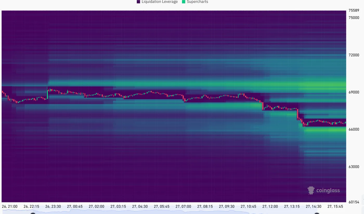 - Liquidity data indicates a potential sweep toward $65,000 and possibly lower support zones.