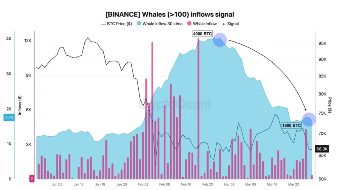 Based on Bitcoin market data, there is a significant behavior change between big owners as the inflows of whales to exchanges have decelerated significantly. According to CryptoQuant data, at the beginning of February, when Bitcoin fell to the $60,000 level, whales began to move large sums to Binance, and the deposits made daily were as high as 11,800 BTC.