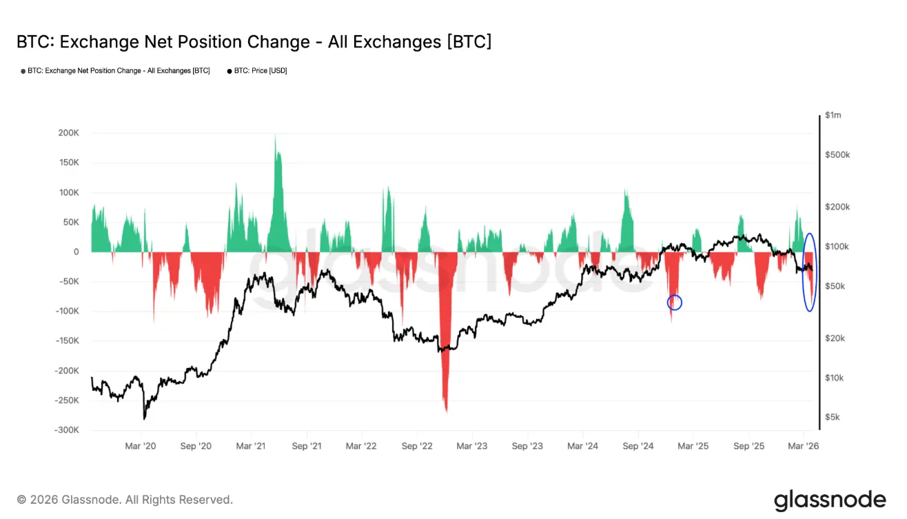 In line with this opinion, on-chain data show that the accumulation of whales and large investors has been constantly increasing in the last two months. This trend is supported by the fact that exchange balances have decreased significantly, with net position change decreasing by 89,710 BTC on March 26, the largest outflow since December 2024.