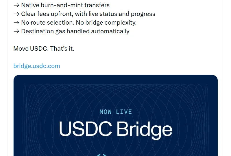 Circle has implemented its native USDC Bridge solution making USDC enter a new usability phase. The new interface is based on the Cross-Chain Transfer Protocol developed by Circle, which enhances the ability of users to transfer USDC between networks. The system is set to eliminate technical friction and focus on both seasoned traders and new users trying to navigate blockchain ecosystems.