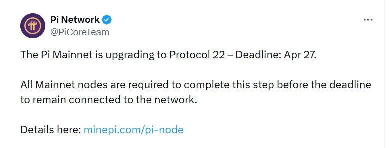 One of the biggest triggers to the recent recovery is the announcement of a protocol upgrade deadline by the Pi Core Team.The developers stated that all mainnet nodes will need to upgrade to version 22 by April 27 in order to stay connected.