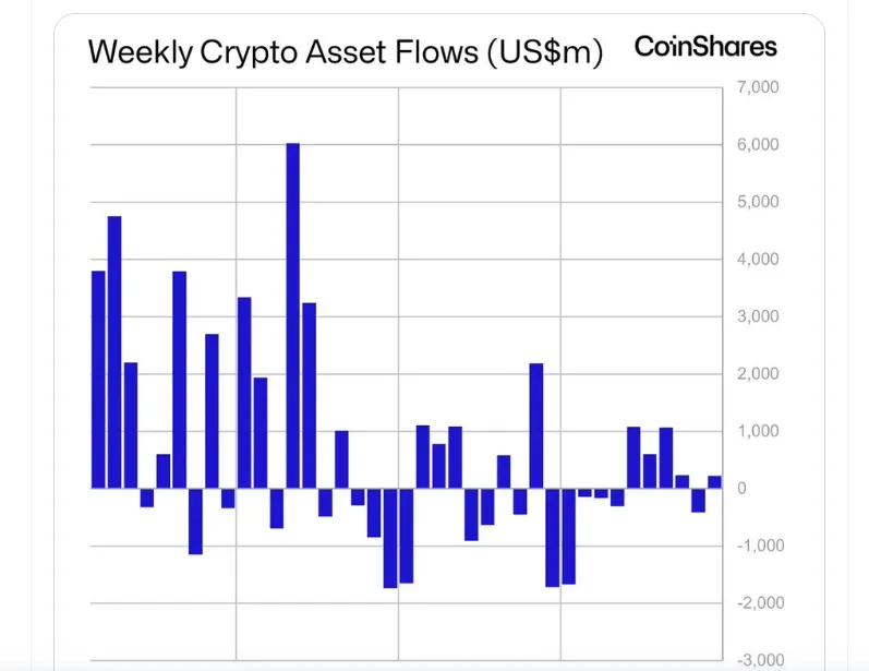 CoinShares recorded that total inflows to crypto funds were $224 million, indicating a renewed confidence of institutional investors after weeks of outflows.