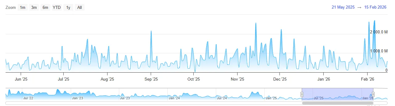 The data between May 2025 and February 2026 indicates that the volume of XRP payments has been on a steady downward trend. In the previous period, the number of transactions was higher, with more frequent spikes, indicating increased network activity. According to XRPSCAN, there are still some surges in transaction volume for XRP; however, they have not changed the general trend.