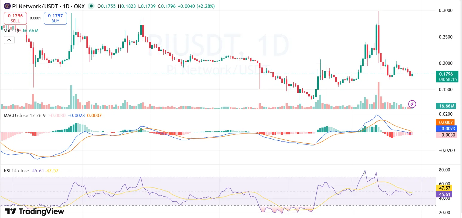 - Pi price remains weak near $0.174, with technical indicators reflecting subdued momentum and continued seller dominance.