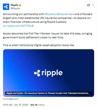 The Ripple Kyobo Life partnership forms part of Ripple’s broader activity across the Asia-Pacific region.  In March, Ripple announced plans to acquire BC Payments to obtain an Australian Financial Services License, a step linked to expanding regulated operations in Australia.