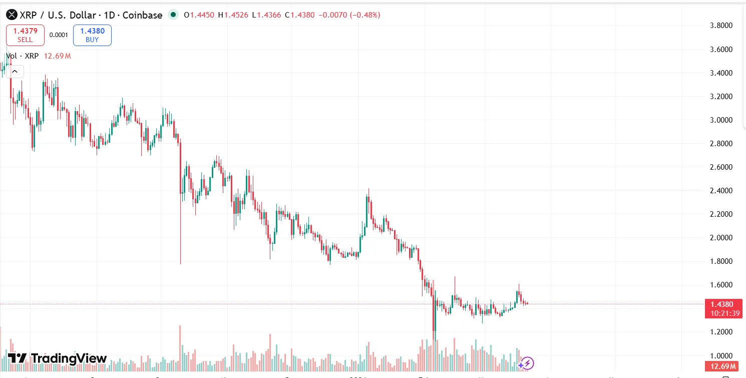 XRP remained under pressure this week after failing to sustain its move above the $1.60 resistance level, forcing the token to fall back below $1.50. At the time of writing, XRP traded near $1.44, while daily trading volume stood around $1.61 billion, reflecting a decline of more than 1% over the past 24 hours.
