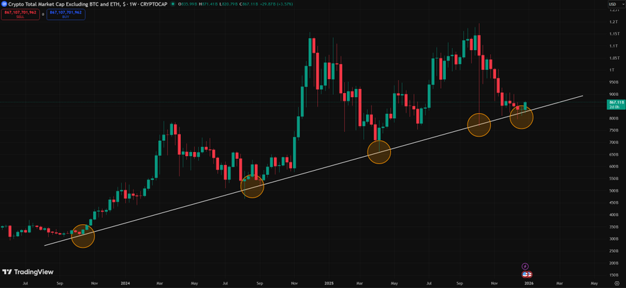 The altcoin market holds a rising weekly trendline, signalling accumulation and potential breakout toward the $1 trillion resistance zone.(source;X)
