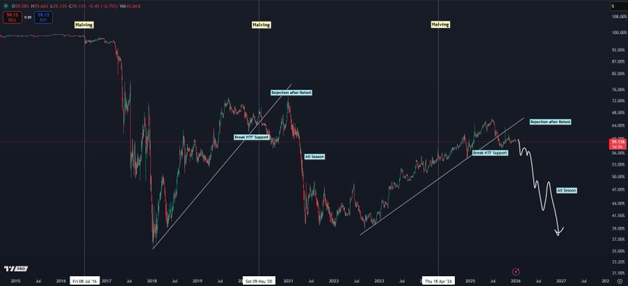 Bitcoin dominance repeats history: a post-halving breakdown, a failed retest, and a structural shift pointing toward an altseason expansion. (source: X)