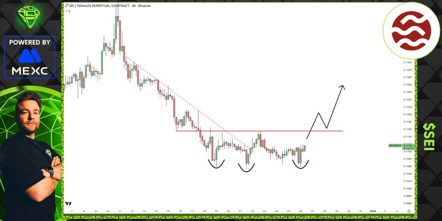 In particular, the SEI/USDT perpetual contract on the 4-hour chart shows a transition from aggressive selling to early accumulation. The price declined from $0.135-$0.140 and kept finding base levels in $0. 108-$0. 110.