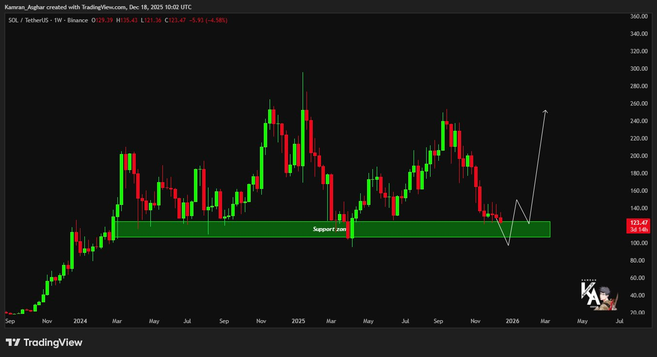 - Solana has tested the $100–$130 demand zone, this indicates it as a structural accumulation support zone which may spark a significant relief rally into 2026.