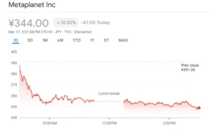 On Tuesday, Metaplanet stock dropped 12.02% and traded at 344 JPY at the end of the session after reversing earlier gains. Intraday trading ranged from 390 JPY to 342 JPY, with volatility increasing.
