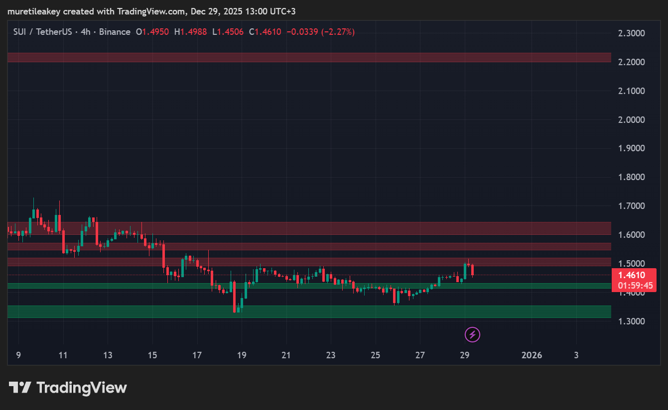 If SUI does not break through the $1.50 resistance area, it may have to retest $1.45 or pull back further towards $1.43; this would still create the basis for a healthy recovery, where consolidation will likely take place before any future rally attempts.