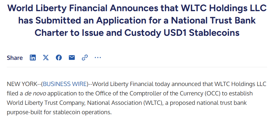 • World Liberty Financial applied to issue a national trust charter to manage the USD1 issue.