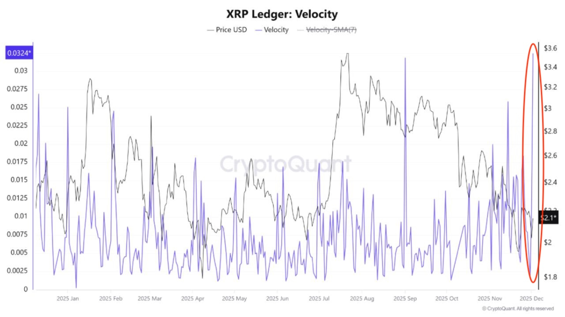 XRP velocity shifted alongside price moves and intensified during the strong rally that peaked in late summer. Notably, the drop that followed matched the uneven on-chain activity seen during the pullback.